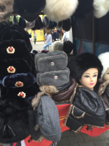 Am Ceckpiont Charlie. Russische Mützen und Gasmasken am Checkpoint Charlie Berlin